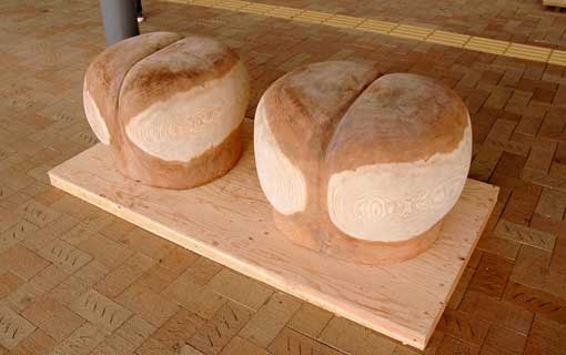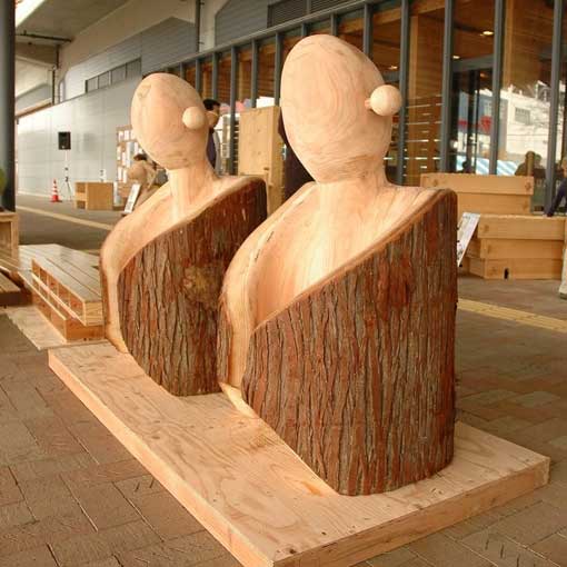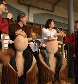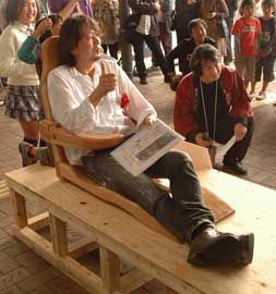 | まさに今回のテーマ『座』に沿った作品でした。 『座』と言う文字を椅子にしてしまうという大人の発想からは出てこない作品です。 写真のように人が二人座るとこの椅子が完成されます。すばらしい! |