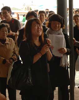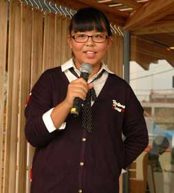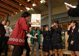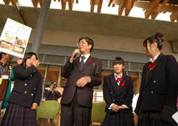 | 左下:3人娘に突っ込む司会の千代田さん。右下:校長先生も応援メッセージ。 | ||||||||||||||||
