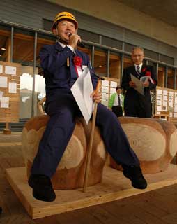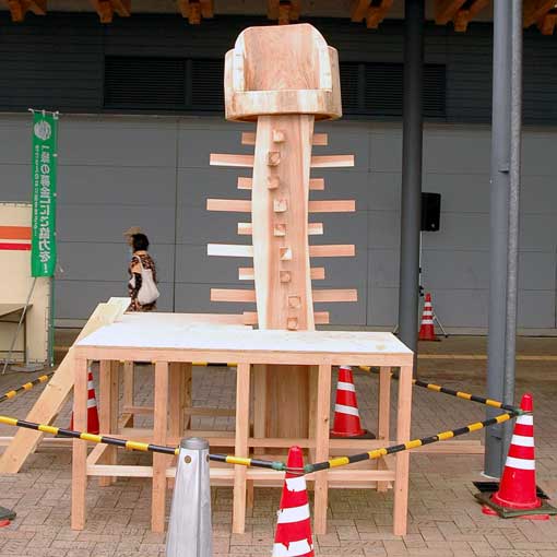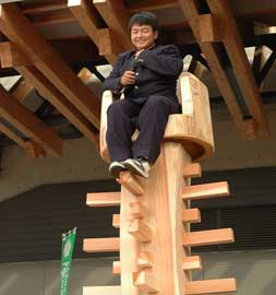 | またもや若き建築家の受賞です。今回、一番でかい作品です。 私は座れなかったのですが、『登る座』に座ると何だか偉くなったように感じるそうです。 はしごの部分は1本の木を削って緩やかなカーブを描いています。日南市長の心を揺さぶった逸品です! |