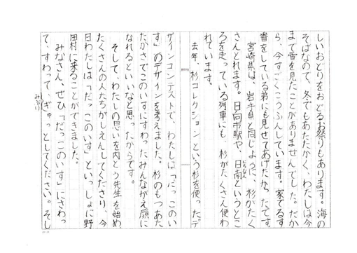 | ●<やすだ・けいさ> 宮崎県日向市立日知屋東小学校3年 杉コレクション2011in日向 子ども杉コレ部門グランプリ受賞 作品「だっこのいす」 http://www.m-forest-a.or.jp/juyou/?catid=53 http://www.m-sugi.com/75/m-sugi_75_sugikore_shimotsuma.html |