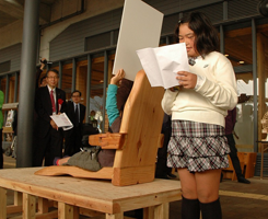 | 杉コレ2011in 日向 子ども杉コレ部門でグランプリを受賞した安田圭沙さんの作品「だっこのいす」 | 最終選考会での安田圭沙さんのプレゼン | |||||||||||||||
