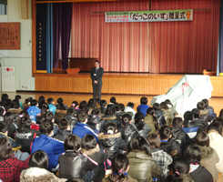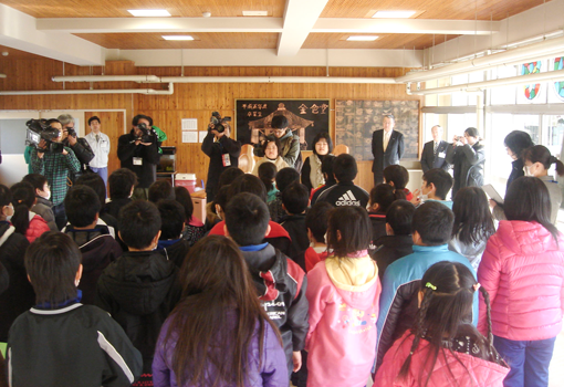 | いよいよ、「だっこのいす」を届けに行くというより、ぼくは見届けに野田村へ発った。しかし、夢と希望に胸を膨らませて旅に出るという心境ではなかった。それは、もちろん、3.11被災地に行くという緊張感もひとつあった。 あとひとつ、圭沙さんの被災地の方々を想う純粋な想いが、邪心のつかない形でどこまでそのまま伝えられるか。そして、どう野田小学校の皆さんが受け止めてもらえるのか・・・。野田村へ向かう新幹線車中、八幡平の美しい山並みを見ながらも、ぼくの頭の片隅から離れることはなかった。 19日の歓迎式にはじまり、20日の野田小学校での「だっこのいす」贈呈式は、そんなぼくの心配を一気に吹き飛ばしてしまった。 歓迎式、贈呈式の会場に一歩足を踏み入れただけで、野田村の方々の優しさ、心遣いが手に取るように伝わり、本当に胸が熱くなった。圭沙さんをはじめ支援いただいた多くの人の想いが込められている「だっこのいす」を迎えるにあたり、どれだけの準備を重ねてこられてきたか想像に余りあった。野田村の小田村長、明内さんをはじめとする職員の皆さん、日當さんをはじめとする岩手県木青会の皆さん、そして野田小学校の先生方と195名の児童の皆さんの一人ひとりの顔、目を見るだけで伝わってくる。同じ場にいるだけで、ひしひしと伝わってくる純真さ、やさしさ、強く真っ直ぐな心。これは、たまらなかった。心から胸打たれた。 全校集会での「だっこのいず贈呈式」に引き続き、圭沙さんと同じ3年生の皆さんとの交流会が計画されていた。まず、クラス全員36名に加え、小田村長、校長先生、担任の先生たちも座ってみて、感想を発表することから始まった。この発表会をはじめ、いろんなプログラムが用意されていて、この日を迎えるための事前の周到な準備がいたる場面で見受けられ、シーン毎に、胸を熱くしていた。 最後は、野田小学校3年生36名の皆さんから圭沙さんにお礼の合唱。これは圧巻だった。大小はあるにせよ被災というつらい重荷を背負っているなか、日向から来た同級生・仲間を迎える、感謝を伝えるために、渾身の声で歌う姿には、参った。思い出すだけで、目頭が熱くなる。この合唱にしても、決して簡単ではない曲をこれだけ力いっぱい歌えるようになるには、どれだけ練習を重ねられたのだろうと思う。そんな過程を想像しただけでも、胸いっぱいになった。 |