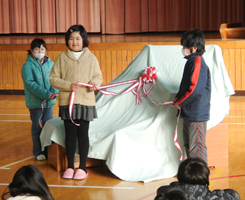 | 「だっこのいす」贈呈式。野田小学校体育館にて。 | 「だっこのいす」の除幕 | |||||||||||||||