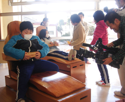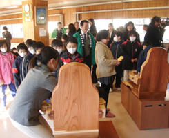 | みんなで順番に「だっこのいす」に座る野田小3年生 | 座った感想を発表しあう | |||||||||||||||