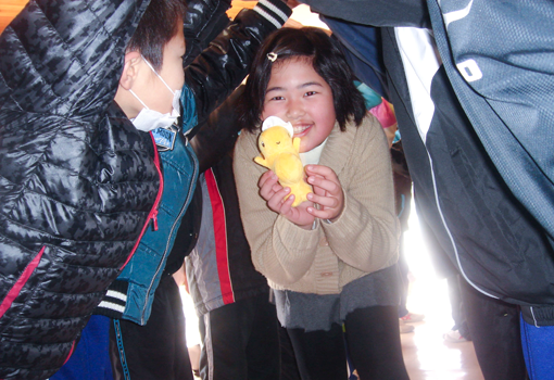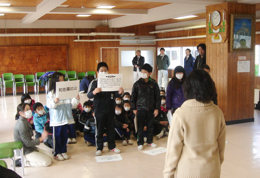 | 交流会にて圭沙さんに野田村のクイズをだす3年生。 | ||||||||||||||||