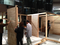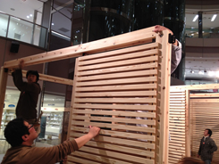 | でも、トラブルと言えばその程度のもので、あとは完璧!ほぼ2時間で6m×6mの杉ブースが組み上がりました。配置の割付を変更してもちゃんと組み上がるところが、フレキシブルな設計になってて、「う〜ん、これはいいよ!」とご満悦なのは設計した千代田と製作担当の川上木材の福原さん、臼井さんの3名のみ。かと思いきや、宮崎県福岡事務所の皆さんまで「素晴らしい!」と大盛り上がり。 | |||||||||||||||||||