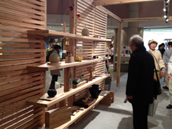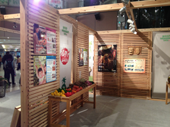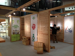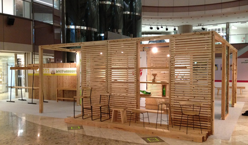 | また、こういったイベントを行う上では、消防署への届け出や食品を扱う場合は保険所に届け出を出したり、行政機関ともやり取りしてチェックを受けなければなりません。特に消防にとっては可燃物で会場を作るってことですから、チェックも厳しくなって当然と思えるのですが、実はこういう仮設のものに対してはそれほどシビアな指導はありません。これも変な話のようですが、よくよく考えると展示会みたいなイベントは期間限定であるし、管理責任者もしっかり付くので、常設するものと違ってチェックはそれほど厳しくないのだと思います。そもそも普通、展示会場には他にももっと燃えやすい可燃物が大量に持ち込まれることが多いですからね。例えば、衣料品の展示会なんかもそうですし、紙を材料にした展示なんか尚更ですよね。そんなものもダメだとなると展示会自体が成り立たなくなってしまう。それでも考えられる予防措置は取って行かなければならないというのが、場所を貸す側や役所のスタンスです。まだまだ木材の活用に関しては、そういった関係者や関係機関の理解が追い付いていない。というより、それだけ一般化していない特殊なケースと言うことですね。 | |||||||||||||||||||