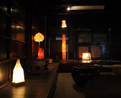 | 江戸時代の建物をお借りし、あかり工房吉野の坂本尚世さんの灯り展を開催しました。 | 吉野の杉・桧、和紙でつくられた灯りが並びます。淡い光には温かさと優しさが満ちています。 | ||||||||||||||