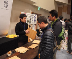 | 吉野木材若手軍団team kasugaiのメンバー、坪岡林業の坪岡常佳さん。吉野杉の赤味の柾目材を使用した折敷を展示しました。 | こちらもteam kasugaiのメンバー、(株)ウッドベースの菊谷紀恵さん。吉野材のクラフト「こだくみ」を展示しました。 | ||||||||||||||