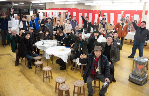 | 銘木と銘酒の町フォーラム2012 パネルディスカッション終了後。「やっ樽(たる)で〜!」「桶(オッケ〜)!」 | |||||||||||||||