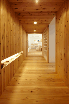 | 中に入っていくと、どの部屋も親子連れで満員状態。少子化なんてどこの話?というぐらいの人口密度です。いい年をした大人が1人で入っていくのは躊躇がいりましたが、いよいよ内田洋行テクニカルデザインセンターがデザイン・設計をてがけたという「木育ひろば」へ。入り口には靴の収納スペースを兼ねた杉のトンネル。突き当りの硝子の引き戸の向こうに0〜2歳までの赤ちゃんが入れる部屋があります。もとは理科室だったそうですが、いまは一面に敷き詰められた多摩産材の杉板の床。浮雲のような間接照明が取り付けられた天井、ところどころに有馬さんのすべすべ杉の作品が置いてあって、あたたかで柔らかなスギダラ空間が広がっていました。(詳しくはスギダラ本部ブログ「スギダラ家の人々」参照) | ||||||||||||||||