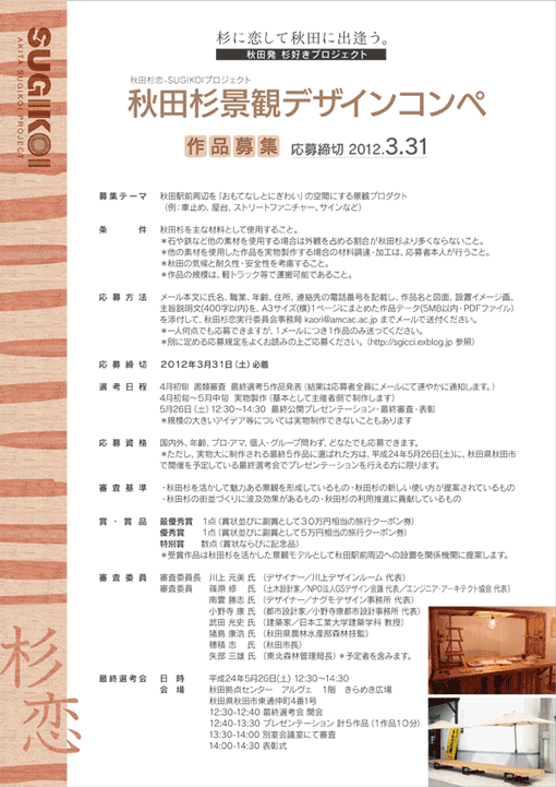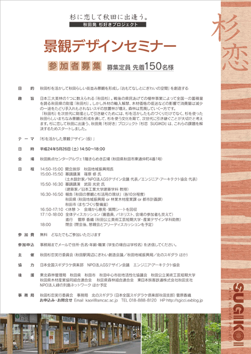 | 桜の便りが聞かれる季節となりました。皆様におかれましてはご清栄のことと存じます。さてこのたび、秋田杉恋実行委員会では、5月26日開催予定の秋田杉景観デザインコンペ最終審査会と景観デザインセミナーにあわせて、第2回スギダラ全国大会を開催することとしました。 | ||||||||||||||||