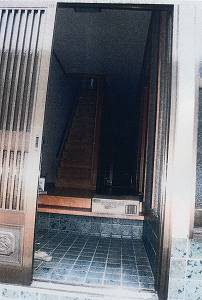 | 玄関アプローチ部分の高低差は、当初ガレージであったが、増築されて高基礎となっている。 | 玄関ポーチ部分レベルと1FLの高低差は約40cmの段差がある。 狭小間口タイプなのでこのように内部構面は1面だけであり、居室と廊下との界壁がそれに当たる。 つまり、間口スパンが2.5間程度の狭小間口では1階内部構面は、1構面以上あることは殆どないのである。 |