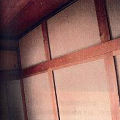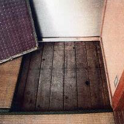 | 2階の和室はラスボードの上、漆喰等が塗られていて、ほとんど真壁造となっていた。 | 2階の床板は和室部分のみ板張りとなっていて、洋室部分では合板張りとなっていた。 |