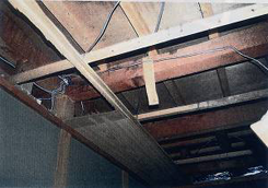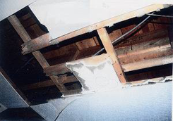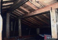 | 1階玄関及び和室周りは、ラスボードの上ジュラク塗りとなっていて、梁までは達してなく天井面で終わっていた。 | 居間部分の天井は模様替え等をされており、古い石膏ボードの上に吸音化粧ボード等が張られていた。 | |||||||||||||||