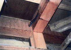 小屋裏部分は雲筋違がなく、束と母屋等で構成されていた。 小屋束と横架材はかすがいで止められているのみである。 |