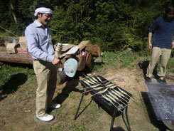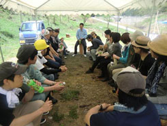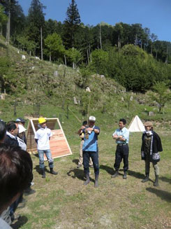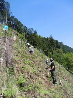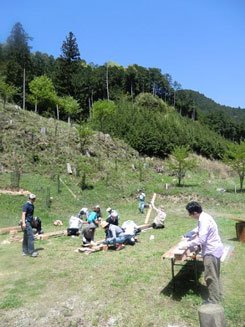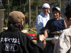 | 二日目。朝からサクラ山に戻り、サクラの植樹体験です。吉野の仲間、お庭屋さんの風人園の大西秀明さんにご指導をいただきました。 中井さんが2年前にサクラを植えられたのですが、鹿の食害に遭う事が多く、なかなか大きく育っていかないそうです。減ってしまった分をみんなで植樹しました。 | ||||||||||||||||||