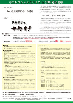 お待たせしました。「杉コレ2012 in 宮崎」が発表されました。!今年はメインテーマ「みんなが笑顔になれる場所」作品テーマが「一人じゃヤタイ」。宮崎市のど真ん中で作品を実際に使用しながらの開催です。楽しく、感動的なヤタイデザインの提案をお待ちしています。 詳しくは下記からダウンロード下さい。 |