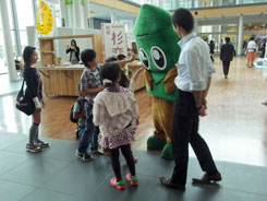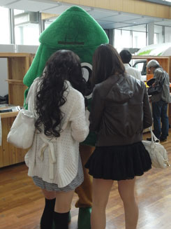 | 杉恋の当日、少し早めに会場に着き、菅原さんにお手伝いできることはないかと話をしたところ、「スギッチの着ぐるみを着て会場を歩く仕事をJR九州の方でどなたかしていただけませんか」とのこと。「います!!!そのために連れて来たといって過言ではない、適役が一人います。」と即座に返事をしました。こうして真野のtallなスギッチは誕生したのです。彼は寄ってくる子供には目もくれず子供のお母さんばかり見て興奮していたに違いありません。こんなに人が寄って来てくれたのも彼の人生の中で最初で最後のことでしょう。私も、彼の晴れ姿を見て涙をぬぐいきれませんでした。(笑) | ||||||||||||||||||