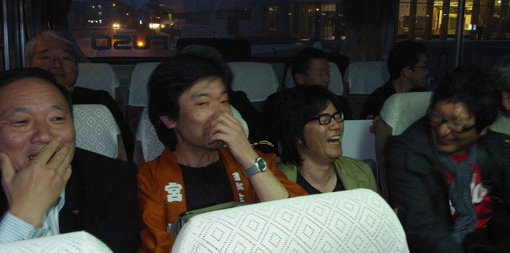 | ユフォーレへ移動中のバスの中、若杉さんの話に爆笑する面々。左から、峰さん、辻さん、崎谷さん、若杉さん | |||||||||||||||