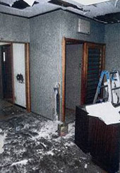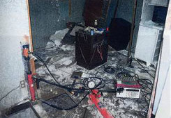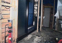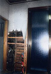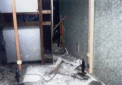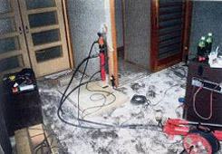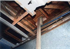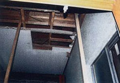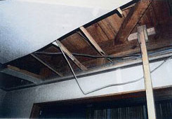 | この計測も、床面に反力をとったため、写真のように床が陥没し、正しい計測データは得られなかった。 (既設の住宅をこのように実験する場合は、天井面のみならず床面の仕上げも取り除くできである。) |