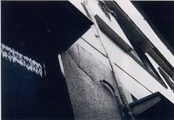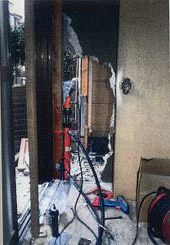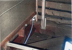 | bVの部屋にまたがってかかる胴差しに対し直交の2階床張りがかかっており、その直交梁の浮き上がりを調べるために、計測点を設けた。 | bVのモルタルつきカウンターウェイトを調べ、その状況を写した。 |