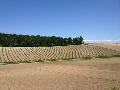 | 美しい大雪山系と緩やかに続く丘陵状の畑と針葉樹。(美瑛) | |
