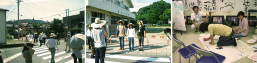 | fig4-6. 高浜もちより市(左)。飛び入り参加で書道パフォーマンスと似顔絵パフォーマンスをする学生(中央)。グループに分かれてまずは自己紹介(右)。 | |||||||||||||||
