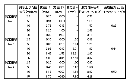 | 以下に、測定番号No.1,No.2,No.9について、長期軸力とした場合の柱カウンターウェイトの値と測定結果を示す。 | |||||||||||||||||