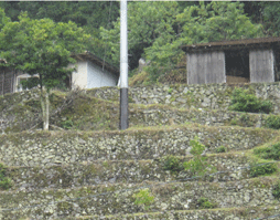 | 日頃の不摂生と体力の衰えを南雲さんと共に感じつつ、小雨の中の「杉の一本乗り」を終えて、久しぶりに全身の筋肉を使った心地良い疲れの中、今晩の宿「さくらぎ旅館」へ入った。 早々に宿を抜け出し、「筏師の昔語り(徳島大学地域再生塾公開講座)」が始まるまでの時間に、雰囲気が気になっていた町並み探訪へ出かけてみた。かつては、どれ程の賑わい華やかさだったことだろう。町並みのそこかしこに、そんな時代の面影が残されている。 那賀町は、石積みの美しい町でもある。長い時間をかけて、住人が積み上げてきた石積みには、暮らしの痕跡がしっかりと残されている。しかし「鉄砲堰」も「筏流し」も「賑わいぶり」も往時を知る人はごく僅かとなってしまった。 |