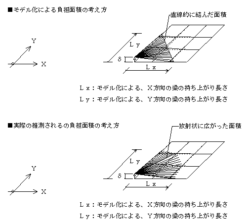 | (2)浮き上がった柱を起点にX、Y両方向の梁の持ち上がった長さが放射状に広がった範囲が負担面積と考えられるが、モデル化に際してはさらに簡略化し、各方向の起点を結んだ3角形の面積を負担面積とした。 | ||||||||||||||||