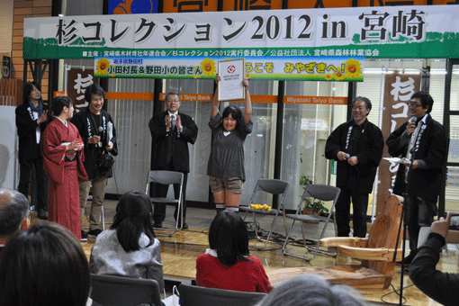 | また、昨年の日向での杉コレでは、「震災でお父さんやお母さんを亡くした子どもたちをぎゅっと抱きしめてあげたい」という思いで応募した安田圭沙さん(当時小学3年生)の作品「だっこのいす」が杉コレ子ども部門のグランプリを受賞し、その作品を実際に岩手県野田村の野田小学校に寄贈するというプロジェクトに発展しました。 | |||||||||||||||
