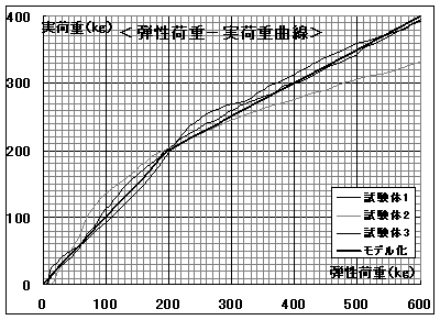 | 柱頭金物単体の引張試験の荷重-ひずみ関係から金物に生じている引張荷重を算定した(弾性域)。 塑性域は、引張試験の荷重-変位関係の弾性直線から得られる荷重と実際の荷重の比率を求め、載荷実験時の金物荷重を推定した(下図参照)。 |