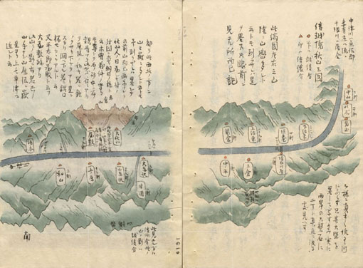 鈴木牧之秋山紀行の挿絵。秋山郷集落の地図。左▲印が信州秋山郷、右●印が越後秋山郷。基本的な集落の配置は変わっていないが、飢餓などで滅び、現在はは存在しない集落もある。 |