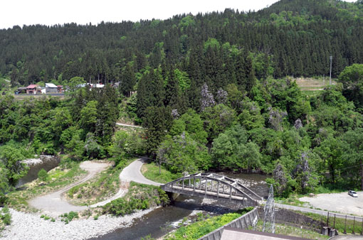 | 温泉の近くに流れる川。水力発電所と同じ頃出来たと思われるコンクリートのアーチ橋がある。永瀬橋、昭和36年竣工。この橋が新潟と長野の県境。 |