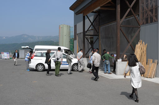 しばらく行くと山原木工所に到着。昔よく家具を頼んだりしていたので馴染みの店だ。社長にバッタリあったので挨拶をすると、喜んでくれお茶を頂きながら昔話をした。いまはね〜なかなか商売もうまくいかないんですよ〜。とか満君の会社や今回の栄村の関係者もよく知っていた。こちらもゆっくりしたかったが、先を急ぐので栃のお椀など買いながら先に進む。そして新潟長野の県境、硫黄川を過ぎ、合流目的地小赤沢に到着。だが電話の電波はピクリとも動かない。「どうしよう・・・」考えたあげく、集落はほとんど無くなるので小赤沢に戻り後から来るはずの本隊を道路で待っていよう!そ言っていると反対方向野河原からからマイクロバスが上ってきた。満君が言った。「多分あの車ですよ。一度見てますから。」「ええ〜じゃあ追い越されたのかな〜それで温泉を見学して戻ってきたのかな〜。」まあいい、とりあえず追いかけよう。するとその車は途中で右折し、どこまでも山の中に入っていく。15分ほど走ると滝の近くで先導車が止まる。降りてきた人々がじいさんやばあさん達山菜採りの一行だったらどうしよう?そんな心配をしていたが、車の中には若杉さん始め、スギダラの面々が乗っていたのだ。なんだかめちゃめちゃ嬉しかった。再会を感動している時間もなく、満君は夕方から結婚式の披露宴に参加するため、帰らなければならなかった。ありがとう!感謝と別れをつげる。 |