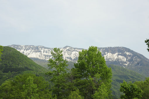 宿に向かう途中温泉から屋敷温泉、無くなった集落跡など見たかったが、時間がなく、すみません今回は我慢してください。と言われ、せめて苗場山や集落の写真を撮らせてください、と言って撮ったのが下の写真。 正面の苗場山(2145m)の西麓、中津川添いの地域が秋山郷。右下に見える集落が秋山郷最大の小赤沢。背後の山にはブナやミズナラの広葉樹と杉が共生している。標高は約1000m、杉林のほぼ限界らしい。つまり、限界集落の限界杉。その杉林の中に藤田満君家の山がある。(驚)この辺りは新潟と長野が入り組み、しかも民有林、官有林も複雑に入り組んでいる。そんな中、長野県森林保護専門員関川さんの森林、自然の説明やビジョンには恐れいった。ひとりの専門家の見識が森林の未来を左右すると感じた。 |