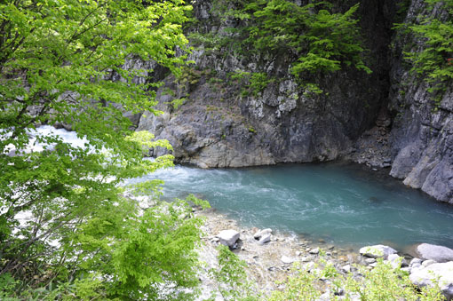 | 満君とは久しぶりで、以前「のーりんじゃー」との対決するために、新潟県森林振興局主催の六日町セミナーで会った以来である。そのあと越後杉の普及を目指し、スギダラ魚沼支部を立ち上げたのだが、未だに会員は僕と満君の2人だけ。そんな思い出話で盛り上がっていると、彼が話し出した。「実は僕のじいちゃんは秋山郷出身なのです。」「えっ!」「はい、逆巻(さかさまき)温泉というところで育ち、熊と戦っていたと言うんです。その後、十日町に婿に行き、サン木材という製材屋を始めたのです。自分の父は製材所を継がずフラワーホームという住宅建設の会社をつくったんです。越後杉の使用量ではおそらく新潟県一ですよ。」「ほう、すごいね。」満君の秋山郷との繋がり、そして越後杉の実績を聞いて少し驚いた。「秋山郷はねー、昔は外界との繋がりがほとんど無く、結婚も集落内結婚がほとんどだったんだよ。」というと「どうりで、僕のじいちゃんは顔めちゃめちゃ濃かったですよー。」「おーやっぱり、まあ藤田君も相当濃いけど・・・(笑)」などと話していくうちに彼がぽつりと言った。「南雲さん、携帯が全然入らないんですが本隊と会えますかね〜。」「えっ、そういえば全然入らない。だけど小赤沢まで行けば多分入るし、奥ちゃんには小赤沢といっておいたから。」そんな会話をしながら新潟県側の秋山郷を楽しんだ。 渓谷の茶屋「平家茶屋」はここに来ると必ず休む場所、中津川渓谷がいつ来てもきれい。周辺を散策し、地の物を買ったり、ビールを飲んだりした。茶屋のおばちゃんに満君の事を話すと、「おじいちゃんの事はよーく知っているよ。残念ながら一昨年無くなったんだよね〜。」さて、あまりのんびりしてもいられないので先を急ぐ。 |