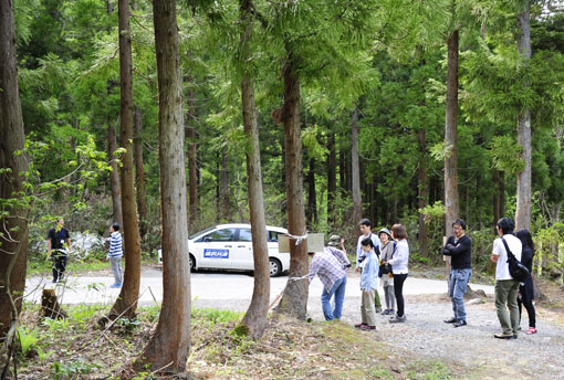 ということでようやく本隊に合流し、杉林を中心に案内をしていただく。集落は何度か見て回ったが、今回は森林が中心。栄村の久保田さん、長野県の森林関係者に連れられ秋山郷周辺の森林を案内していただく。 |