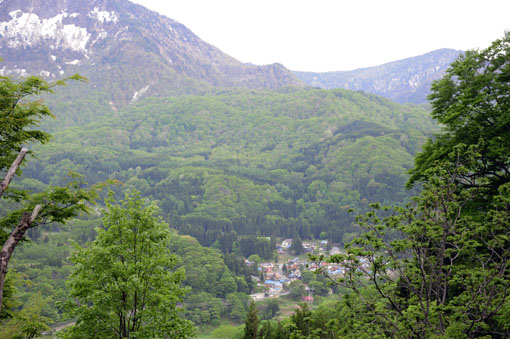 | 苗場山を背後に小赤沢集落を見る。 | |||
