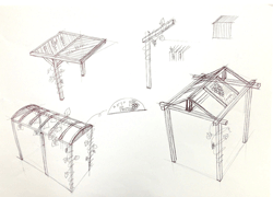 | 時間も大してあるわけでもなかったが、地元の木材加工事業者である森商事さんより材料を提供していただき、個々のメンバーがイメージしたぶどう棚をそれぞれに作ってみた。 | ||||||||||||||||
