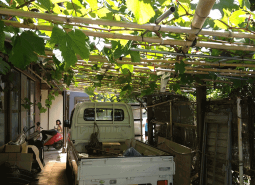 | アイデアの中には車のガレージ兼用のぶどう棚というのがあり、既に二宮さん宅はそうなっていた。 ガレージの屋根でも何でも、個々の住民の家の敷地内に必ずぶどう棚を設けて行けたら・・・そしてその個々の家のぶどう棚同士を道路を超えて繋いで行ったら・・・きっといつかは高浜町内ブドウダラケになって行く。年を重ねる毎にどんどん増殖してる。そんな高浜の今と昔を綴った新しい物語ができることを願って止まない。 |