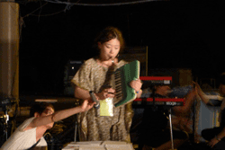 そこには、地元を代表する創作ハイヤ踊りで知られる舞踊集団丸尾會より音楽舞踊ユニット「ミニ丸尾會」とユニークな絶叫バンド「鎮」が参加してくれました。若さ一杯のパフォーマンスで気勢をあげ、さらには、その豊かな音楽性を堂々と訴えかける天草オリジナル音楽集団「音楽商店」の素晴らしい演奏と歌唱に会場は一気に盛り上がりました。 |