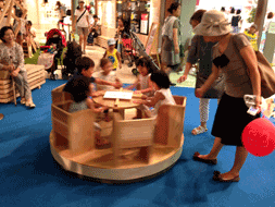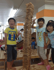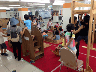 森商事の木育活動の取り組み例。今年の夏、福岡で子供たちの遊べるスペースを提案しました。福岡市天神のショッピングセンター「イムズ」にて(7月20日〜8月25日) |