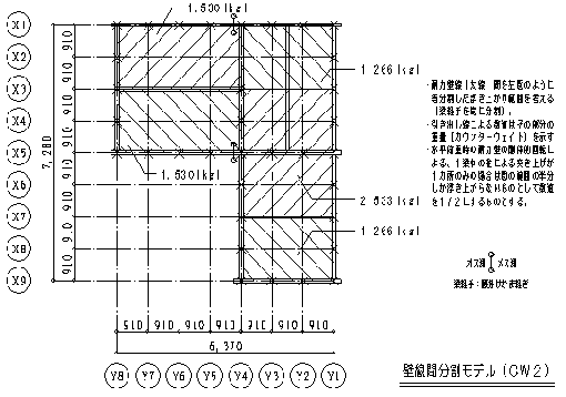 | 耐力壁線を基準に、耐力壁線間を等分割した浮き上がり範囲を考えた。(図39参照) 1つの梁に1カ所のみ柱の突き上げがある場合は、その1/2として計算した。 |