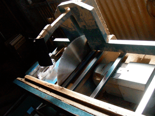 | 箸の加工過程 ダイヤモンドの端がついた円盤鋸で、この乾燥した長さが5m程度の背板を7寸(21センチ)か8寸(24センチ)に切断する。ダイヤモンドの刃を使用しないと、断面(割箸の両端になる)がきれいにならないとのことである。 |