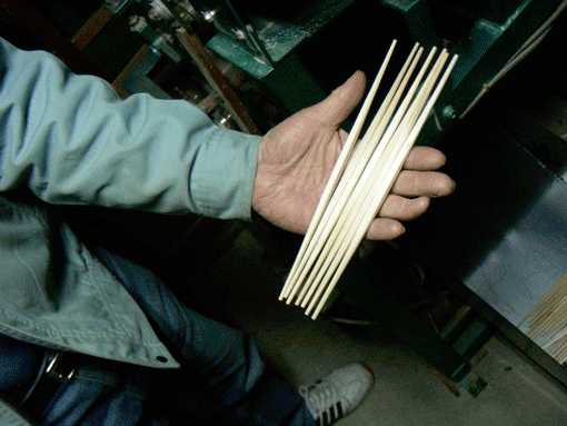 | その後,乾燥(昔は天日乾燥、今は電気乾燥)した後,吉野揉みとよばれる工程がある。これは数百本まとめた割箸を横にして、ゴロゴロと回転させて表面の毛羽をとる作業である。なかなか工夫された細かい工程があり、最後に仕上がった箸を検品する。 | ||||||||||||||||