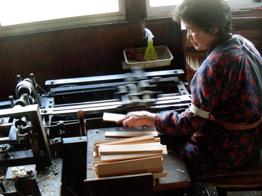 | 製箸機。板にしたものをすばやく、一膳ずつ削ってゆく。 | ||||||||||||||||