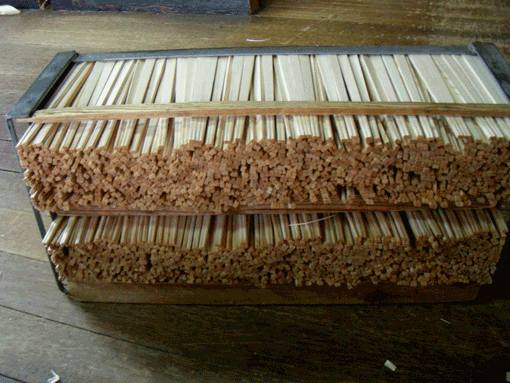 | 一番高級な利休箸(らんちゅう、ともいう)の場合は、1級品から5級品までに目で検品します。素人目には、どこが悪いのかわからないが、目を凝らすと小さな穴があいていたり年輪がきれいでなかったりするので歩留まりが悪くなります。商品価値がないという赤身の利休箸を頂いて使用してみたところ、1年間使用しても折れず腰が強く大変素晴らしい品質であるということがわかりました。しかし、今では国産間伐材の割り箸の正しい使い方は「使って捨てるのがエコである」と分かり、元禄や天削の割り箸は洗って使う事はしないようにしているのだが、さすがにらんちゅうは捨てがたい上等な割り箸です。 | ||||||||||||||||