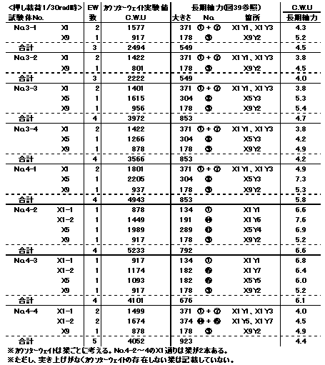 | この計算法によるカウンターウェイト値(今回はQは終局耐力時(層間変形角1/30rad時とする)の水平耐力を耐力壁数で除したものを代入した)を、今回の実験によるカウンターウェイト値CWU、モデル化によるCW1、CW2と共に、表10に示す。 またそれを各試験体の合計値をまとめたものを次ページに簡単な表に示す。 |